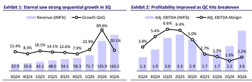 * Eternal reported 3QFY26 net revenue of INR163b, up 20.7% QoQ, above our estimate of 11.8% QoQ growth.