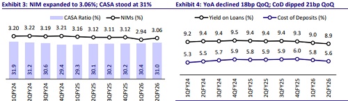 * NIM expanded 12bp QoQ to 3.06%, driven by an 18bp decline in the cost of deposits and moderation in the cost of borrowings. Yield on advances declined 14bp, while a 2bp impact came from optimization of other assets and liabilities, along with a 1bp boost from CRR.