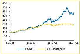 Agilus Diagnostics: Network expansion and specialty mix to drive sustainable growth: The diagnostics segment of FORH is positioned for scalable growth through aggressive network expansion and higher-margin test mix. The company expanded to 4,370 customer touchpoints, with continued additions expected to drive volume growth and improve accessibility. Preventive diagnostics contribution increased to 12%, while specialized testing reached 35%, both expected to rise further, supporting higher realizations and profitability. We believe that network expansion, preventive healthcare adoption and specialty diagnostics scaling will enable sustained revenue growth and maintain structurally higher EBITDA margins over the medium term.