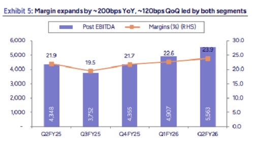 Fortis Healthcare (FORH) reported strong EBITDA of Rs5.6bn in Q2FY26, up 28% YoY, marking another quarter of a strong beat across segments. Though hospital margin has improved by 500bps bps YoY over FY23-H1FY26 to 22.5%, we see further scope for improvement aided by 1) improving case and payor mix, 2) cost rationalization initiatives and ramp-up of Manesar and Greater Noida unit, and 3) new brownfield bed additions. Additionally, we expect margin to expand further, driven by the recent acquisition of Shrimann Hospital and the O&M agreement with Gleneagles.