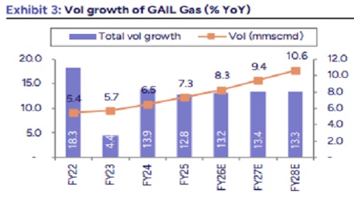 GAIL Gas- staring at a market cap of ~Rs100bn: The company is expected to grow its CNG/PNG portfolio at 18% CAGR for next three years. Excluding bulk sales, we estimate that the company made EBITDA/scm of Rs5.1/scm. Independent listing would definitely raise focus on both growth and profitability. We estimate that GAIL Gas on a standalone basis may fetch a PAT of Rs6.8bn in FY28E. Valuing the company at 15x (~25% premium to IGL & MGL due to high growth and improvement in profitability), it would easily command a market cap of ~Rs100bn.
