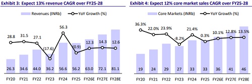 * We expect a CAGR of 13%/18%/24% in sales/EBITDA/PAT over FY25-28 to INR81b/INR20.6b/INR13.5b, factoring a) a revival in US business on the back of product introduction, b) increased revenue growth prospects in Cenexi after infrastructure upgrade, and c) increasing capacity utilization of GLP-1 pens/cartridge for non-regulated markets in the initial phase of patent expiries in these markets. Maintain BUY.
