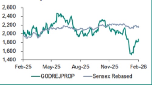 Godrej Properties’ 9MFY26 performance was weak due to higher construction spending and timing of deliveries, but the company is set for a strong Q4 with multiple launches and a large batch of OCs. Additionally, a robust launch pipeline and steady pace of deliveries are driving growth, whereas focus on high-demand micro-markets ensures steady sales velocity. Looking ahead, the company is consolidating its joint ventures positioning GPL for stronger growth, contributing to revenue, EBITDA and net profit. Coupled with resilient demand across core markets and a robust multicity project pipeline, the medium-term outlook remains healthy despite near-term volatility in recognition. Hence, we upgrade our rating on the stock to BUY, with a rolled forward target price of Rs. 2,096, based on 2.1x FY28E book value per share