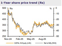Gopal Snacks reported 7% YoY decline in revenue, with sales impacted by the GST transition hiccup (to see full recovery in Q3) and supply-chain constraints. The 4-5M delay in commissioning of the Modasa plant led to Gopal losing out on revenue acceleration in Q3, with benefit of the supply-chain improvement likely being restricted to Dec-25 . Gopal is in the process of going on air about its pan-India media roll-out. This, with trade intervention, is likely to help sequential recovery in sales. Amid sustained hiccups, the management refrained from giving topline guidance for 2HFY26; we believe the benefit will now flow from Q4. Execution would be key, with Gopal looking to recover its consumer base in the next six months. To enhance its endeavors in other states, Gopal has entered a 3P arrangement in Uttarakhand and Karnataka which will focus on the North and South markets, respectively. Its new product interventions in popcorn, wafer biscuits, and now Jeera Papad are accretive and seeing business sustainability. Also, to enhance its play in Gujarat, Gopal is looking at M&A opportunities at a budget of Rs2bn.