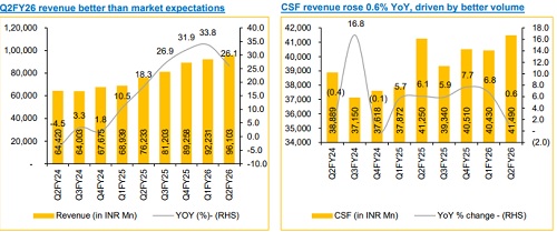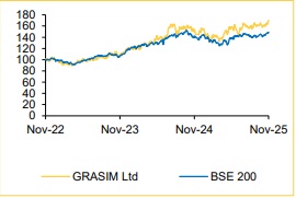 GRASIM reported Q2FY26 revenue and EBITDA of INR 96,103 Mn (+26.1% YoY, +4.2% QoQ) and INR 3,662 Mn (+12.6% YoY, -4.8% QoQ) vs Choice Institutional Equities (CIE) estimate of INR 94,580Mn and INR 3,487 Mn, respectively. The company reported a PAT of INR 8,045 Mn in Q2 (vs CIE est. INR 7,983 Mn). EPS for Q2FY26 is INR 11.8.