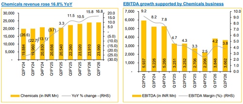 Chemicals Business revenue for the quarter came at INR 23,990 Mn, up 16.8% YoY and 0.3% QoQ, led by higher volume and improved realisation. EBITDA for the business came in at INR 3,650 Mn, up 33.7% YoY but down 13.5% QoQ, driven by higher profitability in the Caustic & Chlorine Derivates segment.
