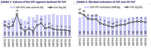 * GRASIM’s standalone revenue/EBITDA/Adj. PAT was at INR96.1b/INR3.7b/ INR8.1b (+26%/+13%/+6% YoY and +4%/+14%/+4% vs. our estimates) in 2QFY26. VSF segment: sales volume declined ~4% YoY, whereas realization rose ~5%. EBITDA declined ~29% YoY (up 9% QoQ) to INR3.5b. OPM dipped 3.5pp YoY (up 50bp QoQ) to ~8%. EBITDA/kg was at INR16 vs. INR21/INR15 in 2QFY25/1QFY26. Chemical segment: volume remained flat YoY, whereas realization rose ~17% YoY. EBITDA increased ~34% YoY to INR3.7b. OPM expanded 1.9pp YoY to ~15%. The paints and B2B e-commerce revenue (combined) grew ~8% YoY to INR26.5b. Loss in new high-growth businesses stood at INR3.2b vs. INR3.7b/INR3.0b in 2QFY25/1QFY26.