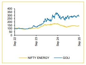 2) Scope of Industrial lubricants: Over the medium term, the demand for Industrial lubricants is expected to outpace the consumption of automotive lubricants. Therefore, there is a possibility of average realised price to drop, leading to decrease in EBITDA margin. However, GOLI has continued to focus on high-growth niches within the Industrial segment, by emphasising on premium products. This is done through its participation in industry events and sequentially acquiring new marquee customers. As a result, we continue to expect the company to exceptionally increase both, its margin as well as volumes.