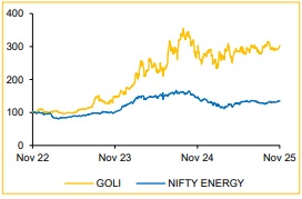 Overhang of EV penetration: GOLI increased its stake in Tirex, an EV charger manufacturing firm, from 51% to 65%, by investing INR 380Mn , underlying the firm’s commitment to be the part of EV supply chain. The firm claims that about 33% of the buses are currently being charged using GOLI’s chargers via Tirex. The company has begun supplying AC home chargers to MG Motor – where EVs form a large share of sales – and is also supplying both AC and DC chargers to other clients, with approvals secured from 12+ OEMs. Meanwhile, the PM EDRIVE initiative offers incentives of up to INR 9.6 lakh per electric truck in N2 and N3 categories. This aligns with GOLI’s acquisition in Tirex, positioning it to benefit from the scheme’s boost to EV infrastructure. We increasingly expect this optionality in the business to reach INR300–400 crores over the next few years with EBITDA margin of 12–14%.