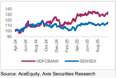 Company Outlook: HDFCB has been consistently performing on its guidance in its endeavour to revert to its pre-merger levels across metrics, and its execution capabilities remain strong. With LDR at a <100% level, the bank will look to accelerate growth momentum in FY26 to match systemic growth. Further acceleration of growth in FY27E, while maintaining a strong deposit growth momentum, should enable HDFCB to bring down its LDR to sub-90%. The margin compression seen in H1 is expected to reverse going into H2, supported by deposit repricing and CRR cut driving exit margins higher. The NIM pressures would be adequately offset by controlled Opex and benign credit costs, enabling HDFCB to deliver RoA/RoE of 1.8-1.9%/15-16% over FY26-28E.
