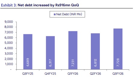 Healthy ARPP and Volumes: Cluster wise, West, East and South grew 17% YoY, 12% YoY and 9% YoY, respectively. While international (Kenya) and Milann grew by 42% YoY and 11% YoY in Q3. ARPP ex of fertility improved by 5% YoY for Q3 and 3% for 9M. Overall IP volumes grew by 8% YoY for Q3 and 13% for 9M. Net debt increased by Rs916mn QoQ to Rs7.7bn.