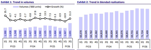 * Volumes were up 11.3% YoY and 23.7% QoQ, aided by a pickup in demand in rural regions. Festive season performance (Aug-Nov’25) was strong, with 16.2% growth in ICE Vahan registrations, outpacing industry growth of 14.7% and leading to a 40bp market share gain. Growth was driven by entry, deluxe, and scooter segments.