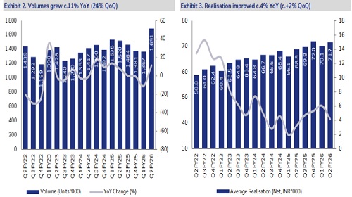 * 2QFY26 - margin above JMFe: HMCL reported net sales of INR 121.3 bn (+15.9% YoY, +26.6% QoQ), in line with JMFe. Volumes during 2Q grew 11.3% YoY (+23.7% QoQ) to c. 1.69 mn units. Realisations improved by 4.2% YoY (+2.4% QoQ), primarily driven by a favourable mix and pricing. EBITDA stood at INR 18.2 bn (+20.3% YoY, +32% QoQ), 2.9% above JMFe. EBITDA margin was 15% (+50 bps YoY, +60 bps QoQ), beating JMFe estimates by 30 bps. PAT came in at INR 13.9 bn (+15.7% YoY, +23.7% QoQ), 2% below JMFe. Spares revenue stood at INR 15.3 bn (+5% YoY), accounting for approximately 13% of revenue during 2Q.
