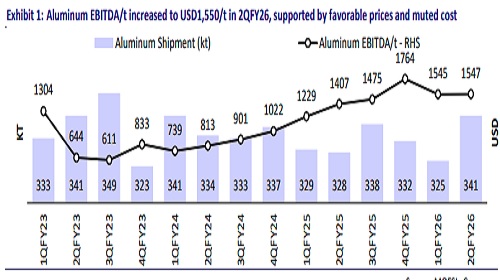 * Upstream revenue stood at INR100.8b in 2QFY26 (+10% YoY), led by higher average aluminum prices. Aluminum upstream EBITDA stood at INR45.2b (+22% YoY; USD1,521/t), driven by higher volume and favorable pricing.