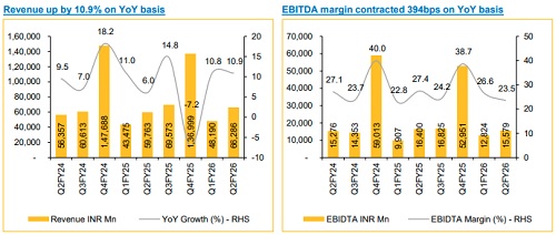 * Revenue for Q2FY26 up 10.9% YoY and up 37.6% QoQ at INR 66.3 Bn (vs CIE est. INR 65.6 Bn)