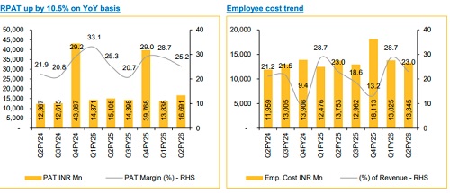 * PAT for Q2FY26 up 10.5% YoY and up 20.6% QoQ at INR 16.7 Bn (vs CIE est. INR 17.1 Bn). PAT margin contacted marginally by 10bps YoY, reaching 25.2% (vs CIE est. 26.0%).