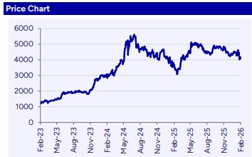 Hindustan Aeronautics (HAL) delivered a 10.7% YoY revenue growth, while EBITDA margin remained flat at 24.3%. HAL continues to demonstrate strong execution and growth visibility, having received fifth GE-F404 engines during the quarter, with five LCA MkA1 aircrafts ready for delivery and an additional nine aircrafts already built and awaiting engine supplies for delivery. While rumours suggest HAL’s exclusion from the AMCA prototype phase, management remains confident of participating in the production phase, expected post-2035. We believe that even in the event of exclusion from the prototype stage, the impact on HAL’s mid-to-long-term earnings is negligible, as AMCA production lies well beyond the current horizon. Meanwhile, a robust confirmed order book provides strong revenue visibility up to 2032, supported by a healthy production pipeline and multiple strategic programmes including IMRH, LCA Mk2 and CATS which are expected to enter production post-2032, reinforcing HAL’s long-term growth and technological capabilities. The stock is currently trading at a P/E of 30.1x/27.3x on FY27/28E earnings. We roll forward to Mar’28E and maintain ‘Buy’ rating valuing the stock at a PE of 35x Mar’28E (38x Sep’27E earlier) arriving at a TP of Rs5,338 (Rs5,507 earlier).