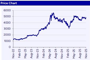 Hindustan Aeronautics (HAL) delivered a 10.9% YoY revenue growth, likely supported by improved execution, though EBITDA margin contracted by 394bps YoY owing to higher provisions. The company further reinforced its leadership in India’s defence and aerospace ecosystem by securing the longawaited order for 97 LCA Tejas Mk1A aircraft valued at ~Rs620bn, alongside a $1.0bn contract with GE Aerospace for 113 F404-IN20 engines to power these jets. During the quarter, HAL’s Nashik division achieved a major milestone with the maiden flight of its first Tejas Mk1A. On the strategic front, HAL is leading a consortium bidding for the AMCA program, which, if awarded, could be a transformative opportunity for the next decade. Additionally, the company entered the passenger aircraft manufacturing segment through an MoU with Russia’s UAC to produce the Sukhoi Superjet 100 (SJ-100) domestically, marking a significant diversification into civil aviation. However, the pace of F404 engine deliveries from GE remains a concern, with HAL receiving only four out of twelve engines committed for the year. The stock is currently trading at a P/E of 34.4x/31.3x on FY27/28E earnings. We maintain ‘Buy’ rating and roll forward to Sep’27E valuing the stock at a PE of 38x Sep’27E (40x Mar’27E earlier) arriving at a TP of Rs5,507 (Rs5,500 earlier).