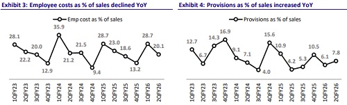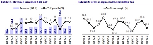 HAL reported a decent set of numbers in 2QFY26 with in-line revenue and PAT. Revenue increased 11% YoY to INR66.3b vs. our estimate of INR67.5b. Gross margin contracted 300bp YoY to 56.1%% vs. our estimate of 59.0%. Lower-thanexpected gross margins and higher provisions created during the quarter led to EBITDA margin contraction of 390bp YoY to 23.5%. Absolute EBITDA declined 5% YoY to INR15.6b. The impact of softer EBITDA performance was, to some extent, offset by lower-than-expected depreciation and higher other income. Thus, PAT increased 11% YoY to INR16.7b. For 1HFY26, revenue/EBIDAT/PAT increased 11%/8%/4% YoY, while EBITDA margin contracted 70bp YoY to 24.8%. For 1HFY26, OCF/FCF increased 159%/180% YoY to INR74b/INR66b. HAL has a cash balance of INR416b as of 1HFY26-end. The company incurred a capex of INR7.3b during 1HFY26 compared to INR4.7b in 1HFY25.