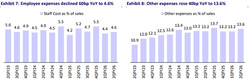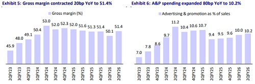 * Net sales grew 2.1% YoY to INR160.6b (est. INR160.6b), while UVG remained flat YoY (est. 2.5% and 4% in 1QFY26). Total revenue rose 2% YoY to INR162.5b (est. INR162.6b). Home Care revenue declined 1% YoY (with UVG up mid-single digit), Beauty and Wellbeing rose 9.1% YoY (UVG flat), Personal Care remained flat YoY (UVG up high-single digit decline), and Food & Refreshment sales grew 2% YoY (UVG up low-single digit).