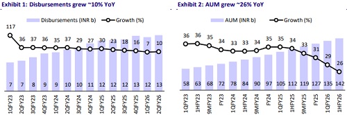 * Management acknowledged that disbursement volumes were marginally lower than earlier expectations, led by broader macro uncertainties, monsoon-led disruptions, and a deliberate tightening in underwriting amid tariff-related uncertainties in select regions. However, the growth momentum for disbursements is expected to strengthen in 2H, driven by improving macros, GST rate cuts, and benign inflation. The company guided for AUM growth of over 25% in FY26, and our FY26 AUM growth estimates are in line with the company’s guidance.