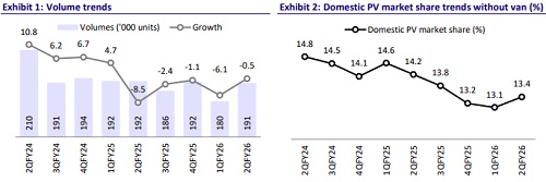 * Revenue improved marginally YoY to INR175b (in line) despite a marginal decline in volumes. While domestic sales declined ~7% YoY to 140k units, exports grew strongly by ~22% to 51.4k units. Avg ASP was up 1.7% YoY due to an improved mix.