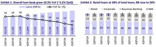 * Advances grew 10.3% YoY/3.2% QoQ, led by healthy growth in Business Banking (BB) segment and a recovery in Retail segment. Deposits were flat QoQ (up 7.7% YoY), while CASA mix stood at 40.9%.