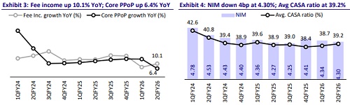 * Notwithstanding the scale of the franchise, the pace at which the bank has reduced its deposit cost over the past two quarters (down 36bp in 1HFY26) demonstrates remarkable agility and leadership execution. This has enabled the bank to deliver 3bp QoQ expansion in adjusted NIMs vs. our consensus expectation of a decline. The bank remains focused on delivering superior risk-adjusted returns, supported by prudent underwriting practices and strong credit discipline.