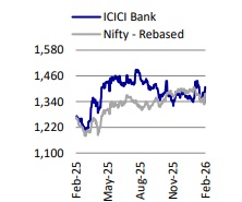 ICICIBC’s credit growth has improved in recent quarters as the bank reported ~11.5% YoY growth in 3QFY26 (4% QoQ). The domestic portfolio expanded at a healthy pace, aided by better traction in secured retail segments and continued strength in BB. Corporate too witnessed healthy traction despite a competitive pricing environment. Management highlighted that demand in the ecosystem has held up well, with early signs of a more broad-based pick-up. The bank remains cautious in unsecured retail, where industry stress pockets have prompted tighter filters and sharper monitoring; however, credit card segment has started showing strong growth. That said, mortgages, CV/CE loans and other secured assets continue to see steady customer activity. With improving sentiment and loan growth picking up, ICICIBC expects to sustain the momentum in 4Q as well. We estimate a 16% CAGR over FY26-28, aided by growth recovery in unsecured retail and corporate segments.