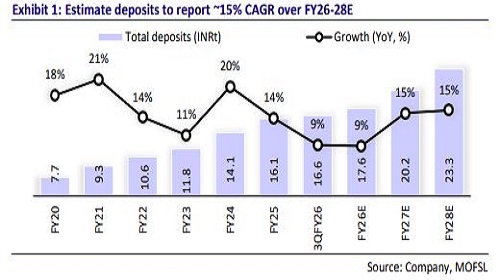 Liability franchise robust; estimate ~15% deposit CAGR over FY26-28E