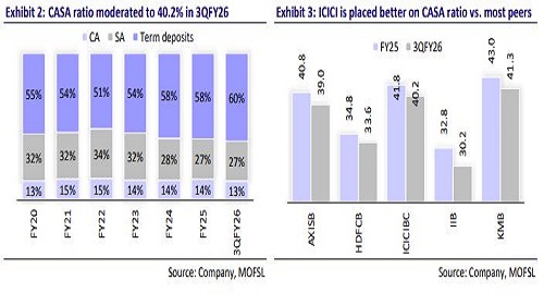 ICICIBC’s credit growth has improved in recent quarters as the bank reported ~11.5% YoY growth in 3QFY26 (4% QoQ). The domestic portfolio expanded at a healthy pace, aided by better traction in secured retail segments and continued strength in BB. Corporate too witnessed healthy traction despite a competitive pricing environment. Management highlighted that demand in the ecosystem has held up well, with early signs of a more broad-based pick-up. The bank remains cautious in unsecured retail, where industry stress pockets have prompted tighter filters and sharper monitoring; however, credit card segment has started showing strong growth. That said, mortgages, CV/CE loans and other secured assets continue to see steady customer activity. With improving sentiment and loan growth picking up, ICICIBC expects to sustain the momentum in 4Q as well. We estimate a 16% CAGR over FY26-28, aided by growth recovery in unsecured retail and corporate segments.