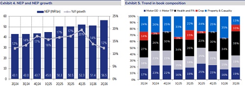 * COR in line, investment performance keeps surprising positively: Combined Ratio was in line at 105.1% (against 104.9% JMFe), with Claims Ratio at 72.1% and EOM to NWP at 33.0%. Claims performance improved sequentially in the key fire, motor and health segments, while substantially deteriorating in crop to 114%, against 96% YoY. For FY26e, we raise our Claims Ratio for crop business, resulting in a pickup in COR to 102.5% (up 25bps from earlier estimates). With competition from public insurers, we also raise FY27/FY28e COR to 102.2%/102.0% against 102.0%/101.8% earlier. Investment performance was strong, with yields of ~8.7%, however, it came with a INR 9.3bn decline in unrealized gains on book to INR 16.4bn, still a healthy number at 2.9% of investment book, even though down from INR 25.7bn in Jun’25.