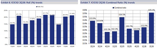 * While growth will optically look better from 3Q, we search for a pick-up to teens: Against reported GDPI contraction of 2% YoY, like-to-like growth was reported at 3.5%, while NEP growth was in line at 12.5%. Industry growth in FY26 has been led by public insurers and ICICIGI has ceded market share to protect profitability. Growth in retail health and fire remained solid at 25% and 50%, respectively, while motor grew by just 1%. In motor segment, GST 2.0 and expectation of tariff hikes in Third Party can result in a pick-up in premium growth for the company. We expect NEP growth for FY26e to remain at 12% levels, before recovering to 15% over FY27-FY28e.