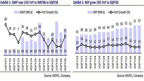 * ICICI Lombard’s (ICICIGI) gross written premium grew 15% YoY in 3QFY26 to INR74.3b (in-line). NEP grew 13% YoY to INR56.9b, (5% miss). For 9MFY26, it grew 13% YoY to INR165b.