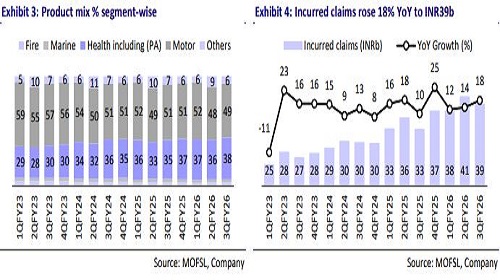 * 3QFY26 witnessed the favorable impact of the recent GST exemption, making health insurance more affordable, while rate cuts in automobile boosted vehicle sales, leading to a recovery in motor insurance.