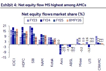 We initiate coverage on ICICIAMC with ‘BUY’ rating, valuing at multiple of 38x on Sep’27 core EPS to arrive at TP of Rs3,000. We are optimistic about its business prospects given (1) its strong performance/parentage which is driving the highest net equity flow market share (17.5% in 8MFY26) among AMCs; (2) its superior equity yields of 67bps due to lowest distributor payout; (3) it accounts for 73.7% of MF sales by ICICIBC due to the latter’s closed architecture; and (4) a higher share of non-MF revenue at 9.2% among peers. We expect equity AAuM CAGR over FY25-28E to be 2.5% higher than industry, leading to core PAT CAGR of 18.5%. Upper band of Rs2,165 suggests a valuation of ~27x on Sep’27 core EPS indicating 17%/16% discount to HDFCAMC (32x) and NAM (32x). ICICIAMC may eventually command a premium to HDFCAMC due to better distribution and diversification while having similar profitability