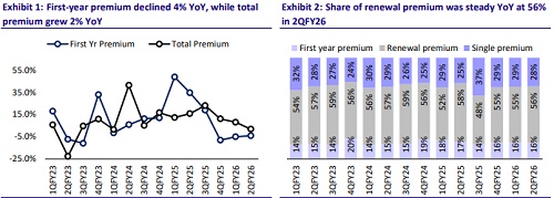 * IPRU’s gross premium grew 2% YoY to INR123b (8% below estimates) in 2QFY26, driven by a 14% YoY growth in single premium, while renewals declined 2% YoY.