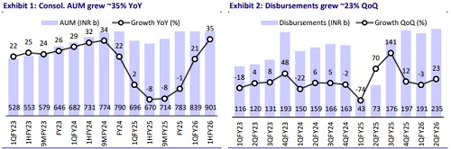 * Consol. AUM grew 35% YoY and ~7% QoQ to INR901b. On-book loans grew ~34% YoY. Off-book formed ~32% of the AUM mix, with co-lending forming ~13% of the AUM mix.