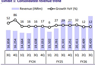 * 3Q consolidated revenue/EBITDA/adj. PAT grew 12%/12%/20% YoY to INR28.4b/INR10.8b/INR6.9b (est. INR6.4b).