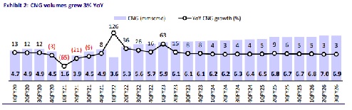 ? Key investor concerns: 1) CNG volume growth stood at only ~3% YoY, primarily due to falling volumes from DTC buses. However, management has highlighted that DTC buses would go to zero in 4QFY26. CNG volume growth, excl. DTC and DIMTS buses, was ~10% YoY in 3Q. 2) With HH prices averaging USD7.2/mmbtu in Jan’26 compared to USD3.7/mmbtu in 3QFY26, EBITDA/scm margins are likely to face pressure in 4QFY26.
