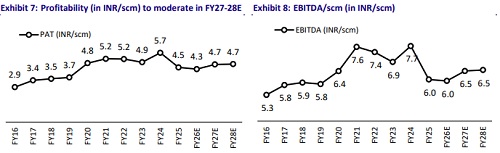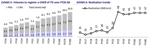 * Our earnings assumptions are conservative: We model an EBITDA/scm of INR6.0/ INR6.5/INR6.5 in FY26/FY27/FY28 vs. medium-term guidance of INR7-8. Further, we estimate 7% CAGR volume growth over FY25-28 vs. 10% YoY growth guided by management. Upside risks: 1) strong growth in new GAs (rising at 20%+ YoY), 2) majority of the GAs now reaching EBITDA positive levels, 3) margin expansion led by a change in taxation in the ONGC-GAIL contract and zonal tariff regulation, and 4) IGL's foray into natural gas distribution in Saudi Arabia, having a volume potential of 4.5- 5mmscmd.