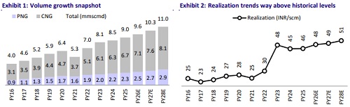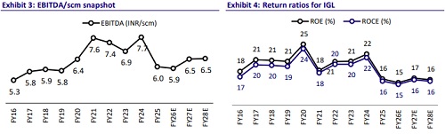 * As per our scenario analysis (refer Exhibit 1 & 2), we estimate an INR0.9/scm EBITDA margin gain for IGL (we currently build in INR5.9/6.5/6.5 per scm EBITDA margin for IGL in FY26/27/28). Hence, if this tax change materializes, it would lead to 8%/15%/15% increase in our FY26/27/28 PAT estimates.