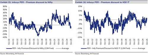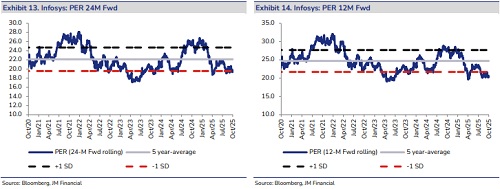 * 2QFY26 growth – Topline beat: INFO reported 2.2% cc QoQ rev growth versus JMFe/Cons. est. of 1.7%/1.8%. Acquisitions contributed 20bps. Growth was led by increased realisations. Among verticals, Hi-tech (+9% QoQ USD), Manufacturing (+5.3%), Communications (+3.6%) and BFSI (+2.0%) led the growth. Retail was the only vertical to see a decline (-2.6% QoQ). EBIT margins improved 20bps to 21.0%, missing estimates (JMFe: 21.3%). Currency (+60bps), Project Maximus (+30bps) including improved realisations offset by increase in subcon were tailwinds. Higher post-sales customer support and other expenses (-70bps) were headwinds. PAT came in at INR 73.6bn in-line with Cons. est. of INR 73.0bn (JMFe: INR 73.0bn). Utilization was stable at 85.1%- near management’s comfort range. Despite 2H being seasonally soft due to furloughs, INFO added 7.8k people, this was attributed to demand visibility.