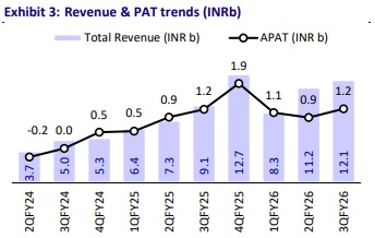 ? Inox Green’s revenue was reported at INR0.8b (+34% YoY, -5% QoQ) with EBITDA at INR0.2b (+46% YoY, +165% QoQ), with EBITDA margins at 27.8% (vs. 10% in 2QFY26). ? Inox Green’s O&M contracted capacity expanded further to 13.3GW in 3QFY26 from 12.5GW in 2QFY26.