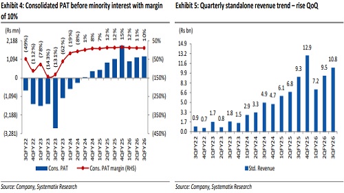 Outlook and view: INXW’s 3QFY26 performance highlighted recurring divergence from guidance. While execution continued to lag expectations, resulting in a topline miss, margin outperformance largely offset the impact on EBITDA. Management attributed the execution miss primarily to customer side site readiness delays, particularly on turnkey contracts, leading to deferred commissioning and lower EPC share. Against this backdrop, management has shifted its guidance from operational parameters to absolute financial metrics, reflecting increasingly unpredictable customer-controlled timelines. The company now guides for ~Rs 50bn revenue in FY26 with EBITDA margins of ~22% and 75% YoY revenue growth in FY27 with EBITDA margins of 20-22%. The revised guidance inherently translates into lower MW execution than earlier expectations, however, the upward revision in margin guidance underscores structural improvement in cost efficiency, supported by backward integration, and expanding contribution from the higher margin O&M business. Based on the revised guidance, we factor in 1,000MW execution in FY26 and 1,552MW in FY27, and cut our FY26/FY27 revenue estimate by 14%/11% while PAT remains broadly unchanged with superior EBITDA margin assumptions.