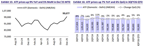 * Lower capacity and higher costs due to cancellations, refunds, passenger monetary support, DGCA fines, depreciating INR/USD, and increasing ATF prices (up 9% YoY/5% MoM to INR99,677/kltr in Dec’25) will lead to high CASK.