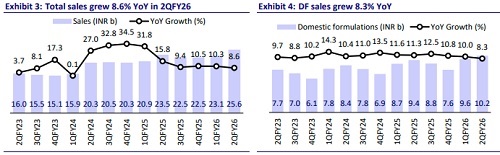 * We raise our earnings estimates by 6%/3%/3% for FY26/FY27/FY28, factoring in a) sustained industry-beating growth in branded DF segment, b) improvement in profitability of Unichem operations, and c) gradual recovery in generics exports business.
