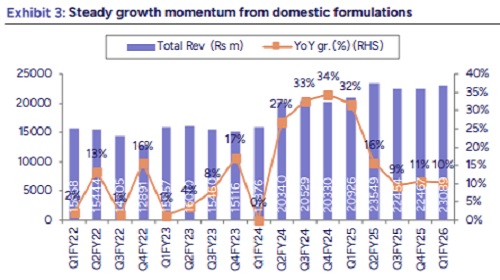 Domestic: Growth was impacted by GST rate rationalization in Sept’25 but strong recovery seen in Oct month. Chronic portfolio share rose to 35%, both acute and chronic segments outpaced IPM. Therapy wise growth; Pain (+10%), CVS (+11%), CNS (+18%), Cough & Cold (+17%), Dermatology/Urology (+11%); Anti-malarials declined (-8%). MR strength at 700, added 2 new cardiac divisions, planning for Cosmeto dermatology division.