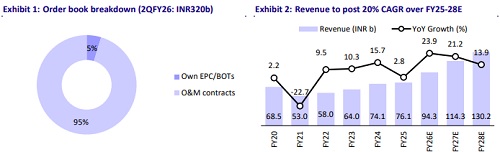 * We retain our estimates for FY26/FY27 and roll forward our valuation to FY28. Backed by attractive valuations, a strong order book, and a robust tender pipeline driven by BOT projects, we expect revenue to register a CAGR of 20% over FY25-28E. We upgrade our rating to BUY with an SoTP-based TP of INR52.