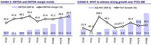 * EBITDA margins came in at 52.8% (vs. our estimate of 48.5%) in 2QFY26 (+450bp YoY and +740bp QoQ). EBITDA grew ~21% YoY to INR9.2b (8% above our estimate). APAT rose 41% to INR1.4b (in line).